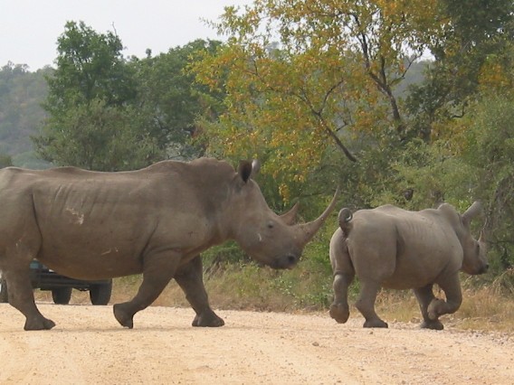 Rhinos blancs zigzagants entre les voitures a Kruger.