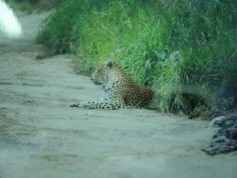 Samedi matin: marche avec un ranger, tres sympa, on s`approche de giraffes, rhinos, et meme buffles ! retour au camp, bien creve par la marche, a 08H00 du mat il fait deja une chaleur de malade ! Gros gros petit dej, puis grosse sieste avant la drive de fin de journee. Sous un soleil de plomb, Manuela et moi accompagnons armelle et Louis, a bord du 4*4 Sani. Rencontre avec un elephant dans l`apres midi, et surtout, au passage d`une riviere a sec, un leopard fait sa sieste sur le sable, a qq 10m de la voiture !! grand moment!! on est reste environ 30 minutes a l`observer, puis elle s`est levee, a disparue dans le lit de la riviere, alors que la lumiere du jour qui baissait annoncee surement pour elle, l`heure de se metre en chasse ... Inutile de vous dire que les autres etaient verts !! Le soir: night drive, pas grand chose a voir. Lendemain retour a Durban, et depart de Manuela.