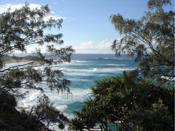 Île en face de Brisbane, au Sud de Moreton Island, campings superbes sur les plages Est, dont notre "secret spot", kangourous visitant le camp, lacs naturels, et mon spot de surf favoris: "cylinders". On rencontre parfois des requins pendnat le surf sur les plages Est, n'est ce pas Alex !