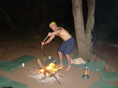 Bad news: one of my beers exploded on the way, as it was on the donkey bag (I didn`t get a lots of clothes, only what I had one me, so I used my bag for beers ...), but the good news: this beer was on rolf`s bag, who didn`t take a lots of clothes as well. I only have two beers now, what a shame, so I went to drink one of them by the river close to the camp, looking at the sunbelt on the bush, that the time of the day I prefer. Just before it get dark, I went for a shower, you have to warm some water from the river in a big pan before. What a pleasure to take a shower in the middle of the bush, strange feeling to be naked in the bush, with just a bucket over your head, full of hot water after a day spend under the sun and in the dust. that was my best shoer ever !!