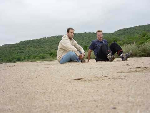 stop for lunch, by the river (this river always present is the black Umfolozi river), we cross it just in the place were Dennis find some crocodiles tracks, cool. To get a place in the shadow, we had to get wet as it was quite deep, so Rolf and me had a swim with our clothes on. We get to the main camp in the afternoon, watch the baboons for a while, they where playing on the rocks, other side of the river: jumping in the trees, chasing each others, ... Dennis told us that they are not so far from human, if you compare them to Rolf and me.